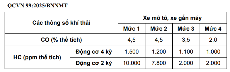 Bộ Nông nghiệp và Môi trường đã có Thông tư số 92/2025/TT-BNNMT ngày 31/12/2025 ban hành Quy chuẩn kỹ thuật quốc gia về khí thải xe mô tô, xe gắn máy tham gia giao thông đường bộ.