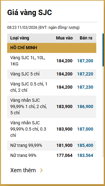 Tại Việt Nam, sáng 11/3, giá vàng SJC được Công ty Vàng bạc đá quý Sài Gòn niêm yết ở mức 184,2 - 187,2 triệu đồng/lượng (mua vào - bán ra).