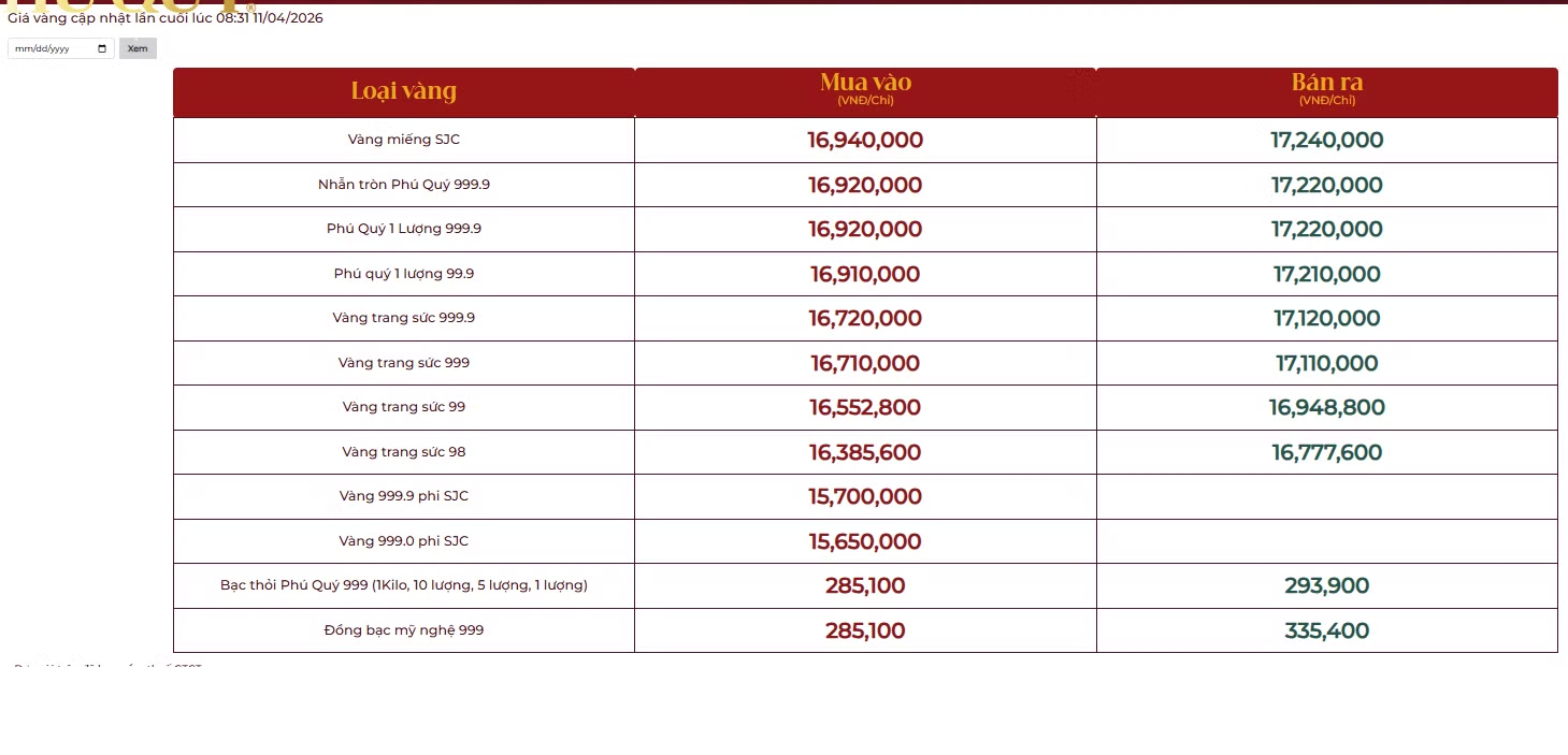Tại Việt Nam, vào sáng 11/4, công ty Vàng bạc đá quý Sài Gòn niêm yết giá vàng SJC tại thị trường Hà Nội ở mức 169,4 - 172,4 triệu đồng/lượng (mua vào - bán ra).