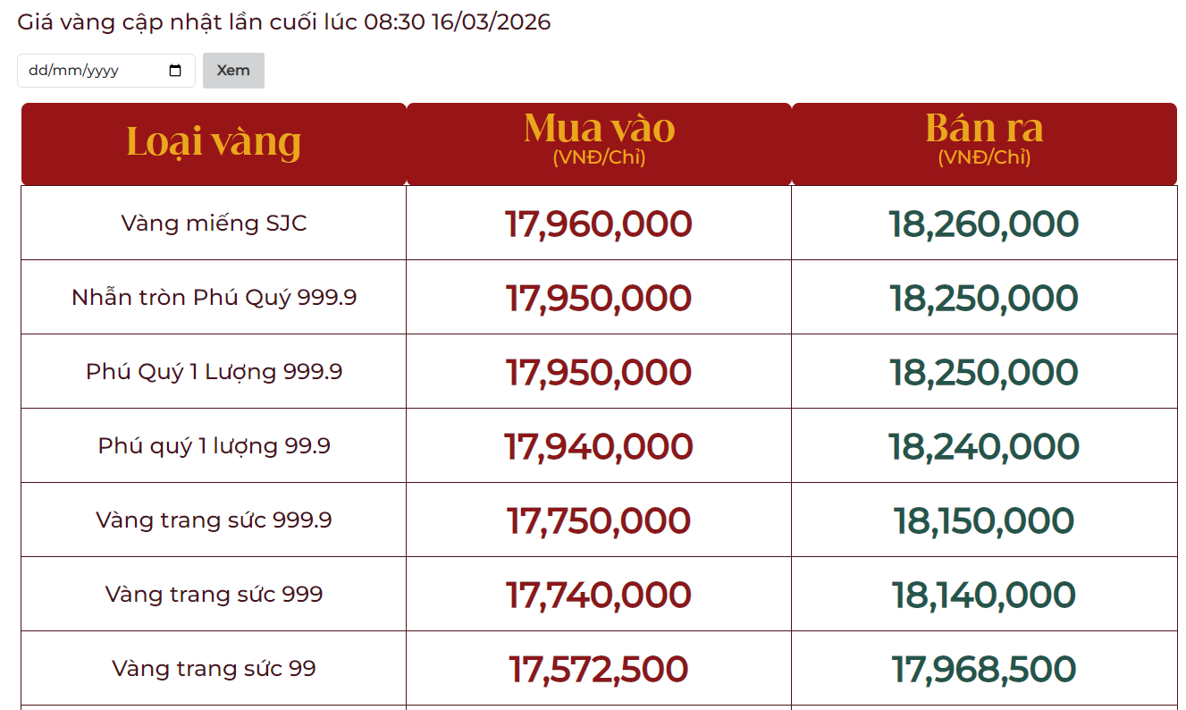 Dưới đây là bảng giá vàng tại một số công ty vàng bạc đá quý trong nước sáng 16/3:
