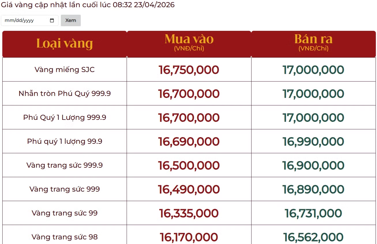 Tại Việt Nam, vào sáng 23/4, công ty Vàng bạc đá quý Sài Gòn niêm yết giá vàng SJC tại thị trường Hà Nội ở mức 166,7 - 169,2 triệu đồng/lượng (mua vào - bán ra).