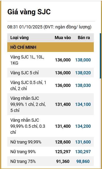 Tại Việt Nam, sáng 1/10, Công ty Vàng bạc đá quý Sài Gòn niêm yết giá vàng SJC ở mức 136 - 138 triệu đồng/lượng (mua vào - bán ra).