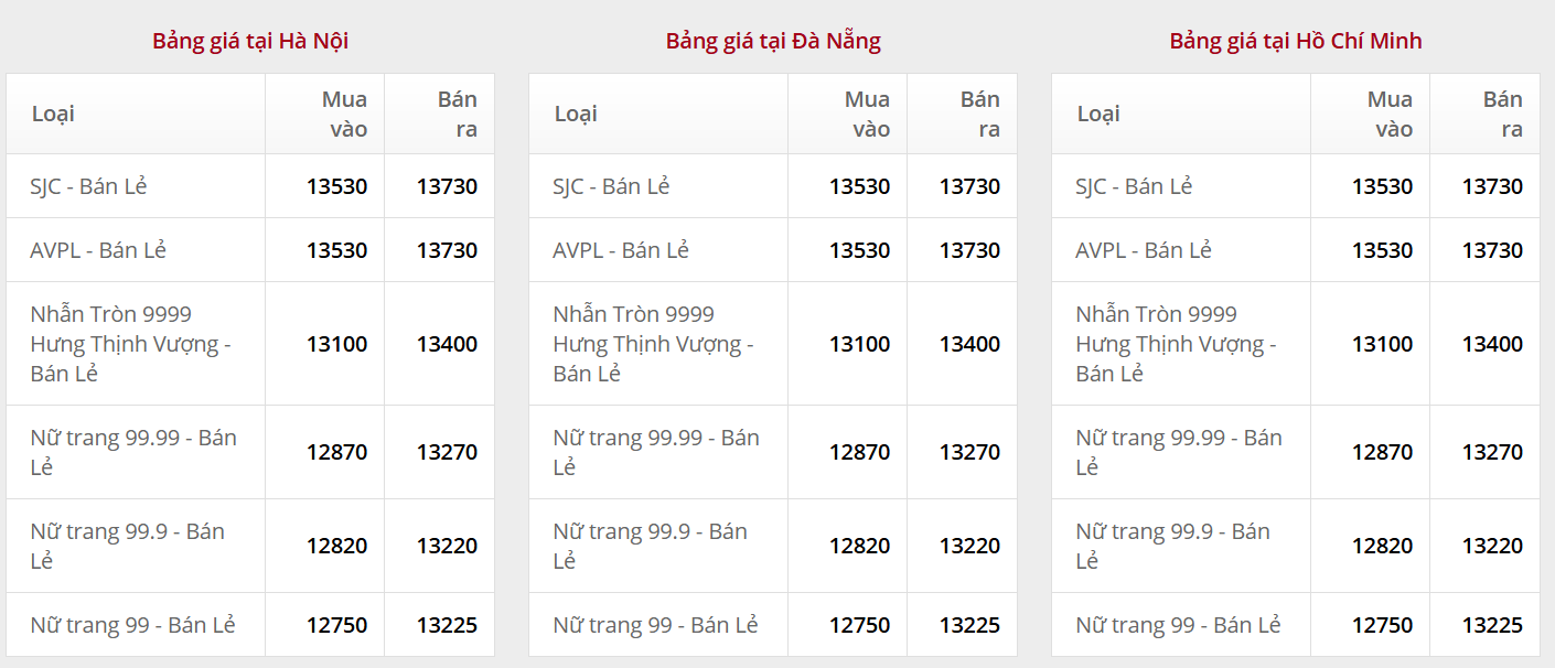 Giá vàng tại Công ty TNHH MTV Vàng bạc Đá quý Sài Gòn (SJC):