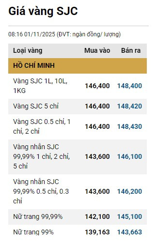 Tại Việt Nam, vào sáng 1/11, Công ty Vàng bạc đá quý Sài Gòn niêm yết giá vàng SJC ở mức 146,4 - 148,4 triệu đồng/lượng (mua vào - bán ra).