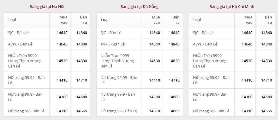 Giá vàng tại Công ty TNHH MTV Vàng bạc đá quý Sài Gòn (SJC):