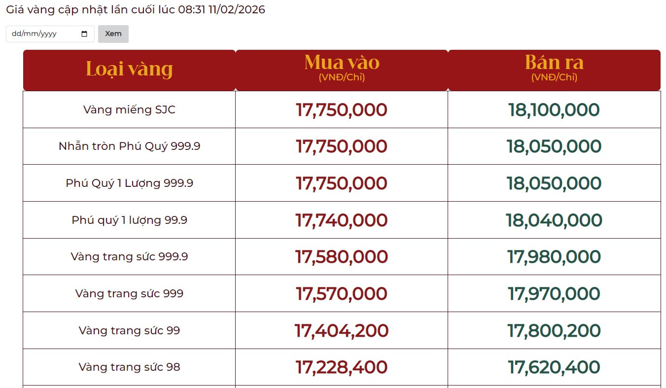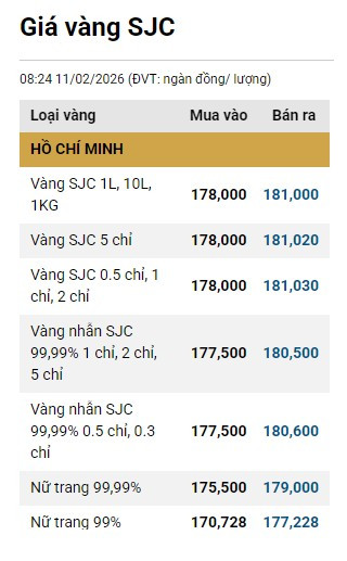 Tại Việt Nam, đầu giờ sáng 11/2, Công ty Vàng bạc đá quý Sài Gòn niêm yết giá vàng SJC ở mức 178 - 181 triệu đồng/lượng (mua vào - bán ra).