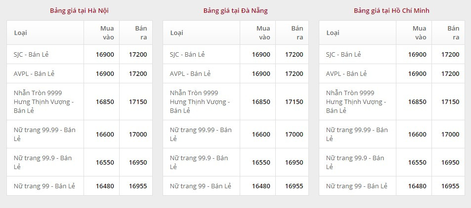 Giá vàng tại Công ty TNHH MTV Vàng bạc đá quý Sài Gòn (SJC):