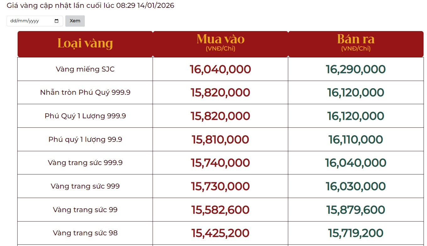 Tại Việt Nam, vào đầu giờ sáng 14/1, Công ty Vàng bạc đá quý Sài Gòn niêm yết giá vàng miếng SJC ở mức 160 - 162 triệu đồng/lượng (mua vào - bán ra).