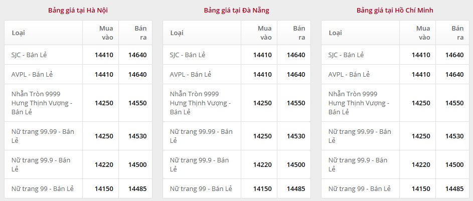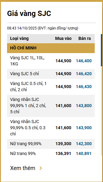 Tại Việt Nam, vào sáng 14/10, Công ty Vàng bạc đá quý Sài Gòn niêm yết giá vàng SJC ở mức 144,9 - 146,4 triệu đồng/lượng (mua vào - bán ra). Dưới đây là bảng giá vàng tại một số công ty vàng bạc đá quý trong nước sáng 14/10: