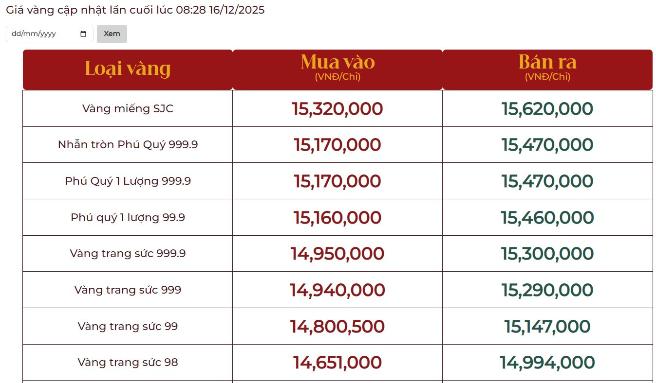 Cập nhật bảng giá vàng ngày 16/12 tại Công ty TNHH MTV Vàng bạc Đá quý Sài Gòn (SJC), Công ty CP Đầu tư vàng Phú Quý, Tập đoàn Vàng bạc Đá quý Doji.