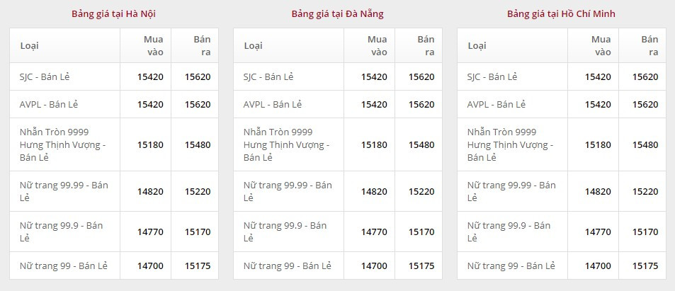 Giá vàng tại Công ty TNHH MTV Vàng bạc đá quý Sài Gòn (SJC):