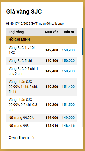Tại Việt Nam, vào đầu giờ sáng 17/10, Công ty Vàng bạc đá quý Sài Gòn SJC và Tập đoàn DOJI niêm yết giá vàng miếng ở mức 149,4 - 150,9 triệu đồng/lượng (mua vào - bán ra).
