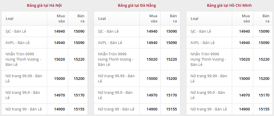 Giá vàng tại Công ty TNHH MTV Vàng bạc Đá quý Sài Gòn (SJC):