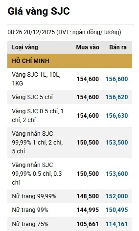 Tại Việt Nam, sáng 20/12, Công ty Vàng bạc đá quý Sài Gòn niêm yết giá vàng SJC tại thị trường Hà Nội ở mức 154,4 - 156,4 triệu đồng/lượng (mua vào - bán ra).