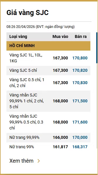 Tại Việt Nam, vào sáng 20/4, công ty Vàng bạc đá quý Sài Gòn niêm yết giá vàng SJC tại thị trường Hà Nội ở mức 167,3 - 170,8 triệu đồng/lượng (mua vào - bán ra).