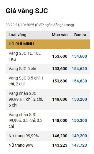 Dưới đây là bảng giá vàng tại một số công ty vàng bạc đá quý trong nước sáng 21/10: