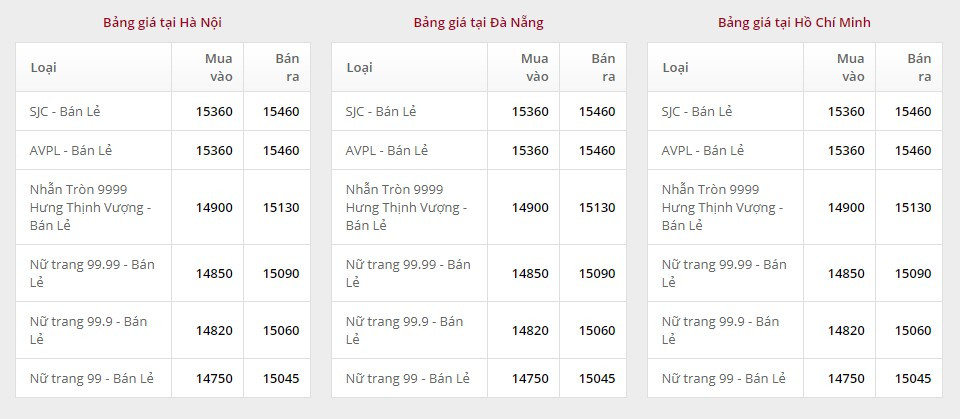 Giá vàng tại Công ty TNHH MTV Vàng bạc Đá quý Sài Gòn (SJC):