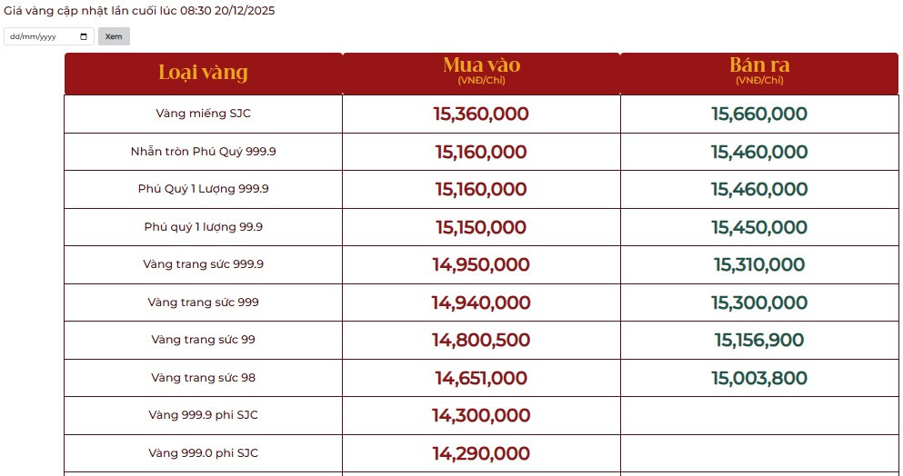Cập nhật bảng giá vàng ngày 21/12 tại Công ty TNHH MTV Vàng bạc Đá quý Sài Gòn (SJC), Công ty CP Đầu tư vàng Phú Quý, Tập đoàn Vàng bạc Đá quý Doji.