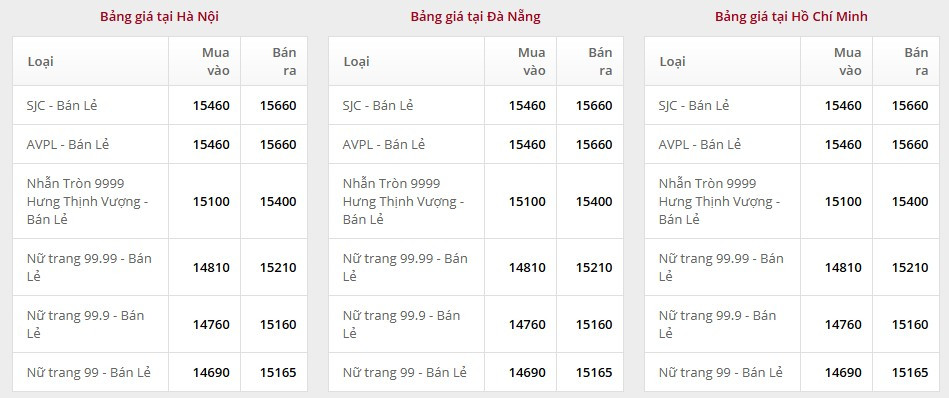 Giá vàng tại Công ty TNHH MTV Vàng bạc đá quý Sài Gòn (SJC):
