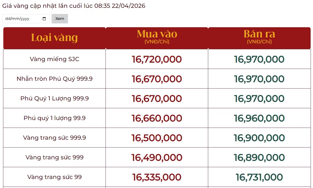 Tại Việt Nam, vào đầu giờ sáng 22/4, Công ty Vàng bạc Đá quý Sài Gòn niêm yết giá vàng SJC ở mức 168,1 - 170,6 triệu đồng/lượng (mua vào - bán ra).