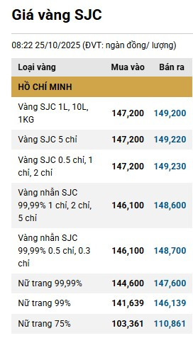 Dưới đây là bảng giá vàng tại một số công ty vàng bạc đá quý trong nước sáng 25/10: