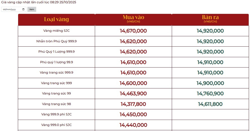 Cập nhật bảng giá vàng ngày 25/10 tại Công ty TNHH MTV Vàng bạc Đá quý Sài Gòn (SJC), Công ty CP Đầu tư vàng Phú Quý, Tập đoàn Vàng bạc Đá quý Doji.