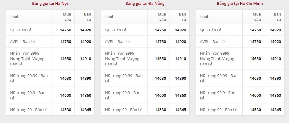 Giá vàng tại Công ty TNHH MTV Vàng bạc Đá quý Sài Gòn (SJC):