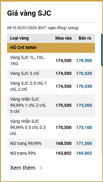 Tại Việt Nam, sáng 26/1, giá vàng SJC tại thị trường Hà Nội được Công ty Vàng bạc đá quý Sài Gòn niêm yết ở mức 174,5 - 176,5 triệu đồng/lượng (mua vào - bán ra).