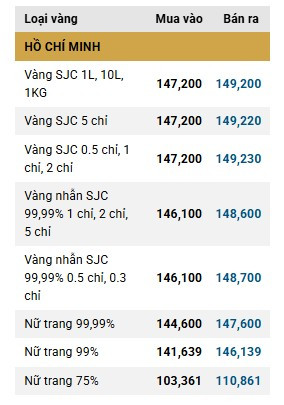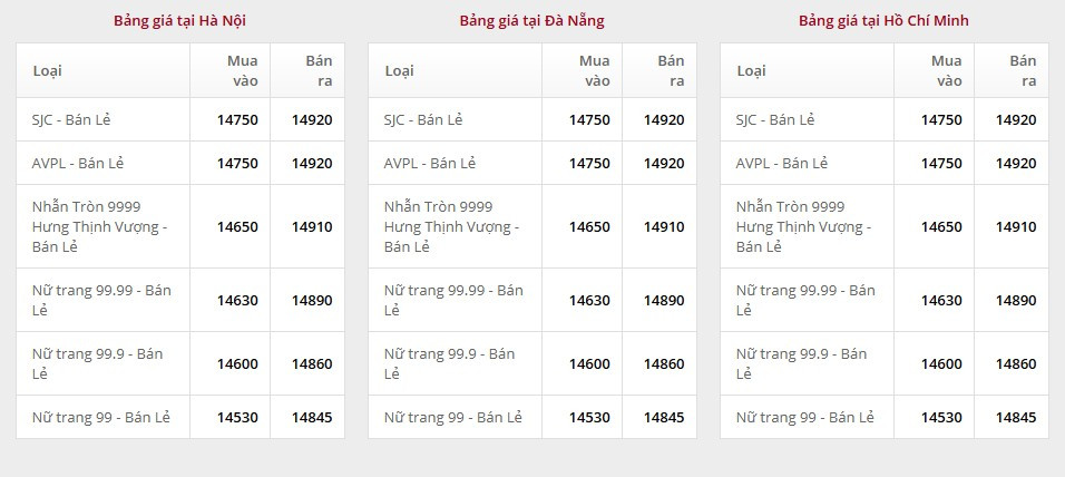 Giá vàng tại Công ty TNHH MTV Vàng bạc Đá quý Sài Gòn (SJC):