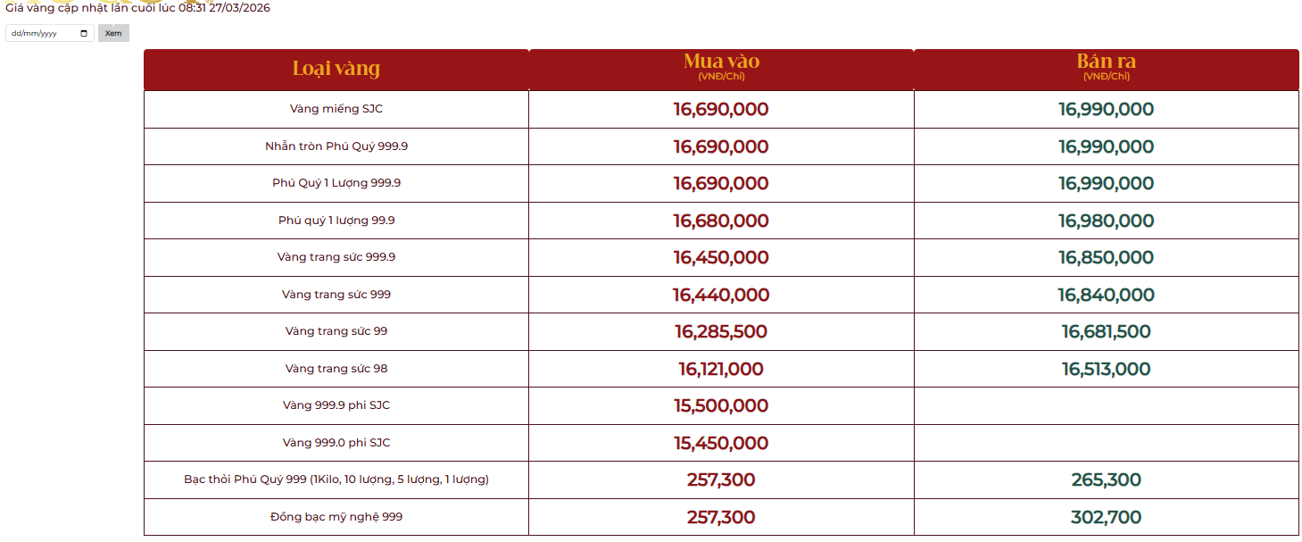 Tại Việt Nam, sáng 27/3, giá vàng SJC được Công ty Vàng bạc đá quý Sài Gòn niêm yết ở mức 166,9 - 169,9 triệu đồng/lượng (mua vào - bán ra).