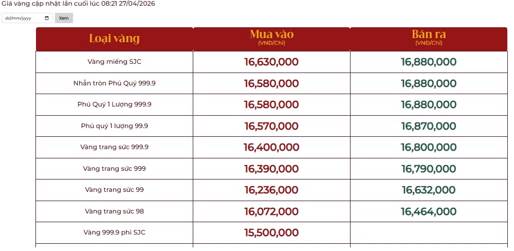 Tại Việt Nam, sáng 27/4, Công ty Vàng bạc đá quý Sài Gòn niêm yết giá vàng SJC ở mức 166,63 - 168,8 triệu đồng/lượng (mua vào - bán ra).