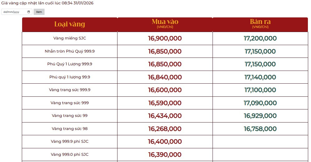 Tại Việt Nam, sáng 31/1, Công ty CP Đầu tư vàng Phú Quý niêm yết giá vàng miếng SJC ở mức 169 - 172 triệu đồng/lượng (mua vào - bán ra).