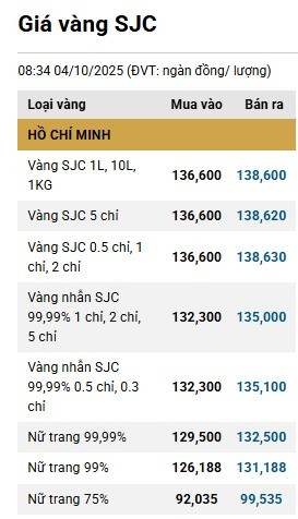 Cập nhật bảng giá vàng ngày 4/10 tại một số công ty vàng bạc đá quý.