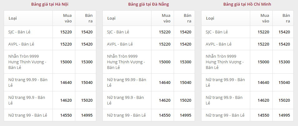 Giá vàng tại Công ty TNHH MTV Vàng bạc đá quý Sài Gòn (SJC):