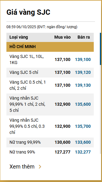 Tại Việt Nam, sáng 6/10, Công ty Vàng bạc đá quý Sài Gòn (SJC) niêm yết giá vàng miếng ở mức 137,1 - 139,1 triệu đồng/lượng (mua vào - bán ra).