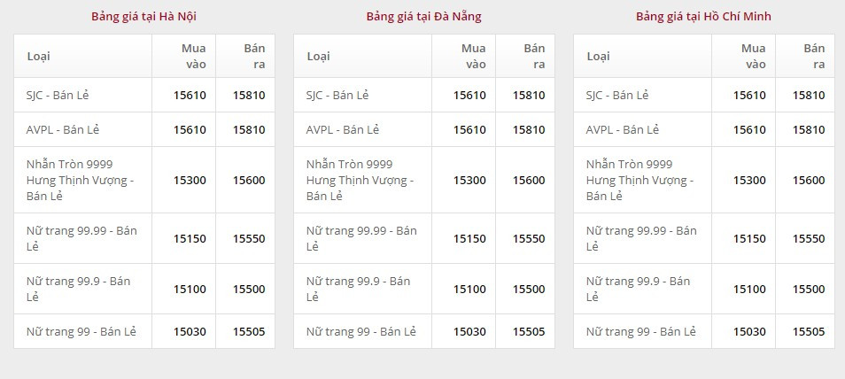 Giá vàng tại Công ty TNHH MTV Vàng bạc đá quý Sài Gòn (SJC):
