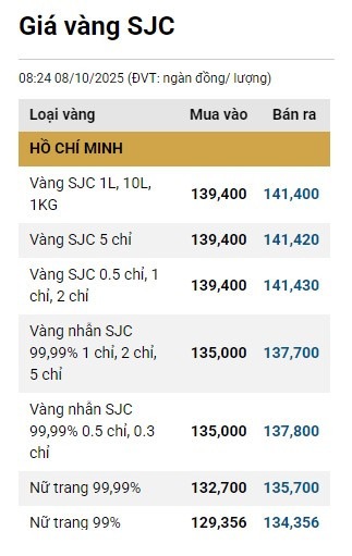 Tại Việt Nam, vào đầu giờ sáng 8/10, Công ty Vàng bạc Đá quý Sài Gòn niêm yết giá vàng miếng SJC ở mức 138,6 - 140,6 triệu đồng/lượng (mua vào - bán ra).