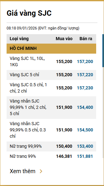 Tại Việt Nam, sáng 9/1, giá vàng SJC tại thị trường Hà Nội được Công ty Vàng bạc đá quý Sài Gòn niêm yết ở mức 155,2 - 157,2 triệu đồng/lượng (mua vào - bán ra).