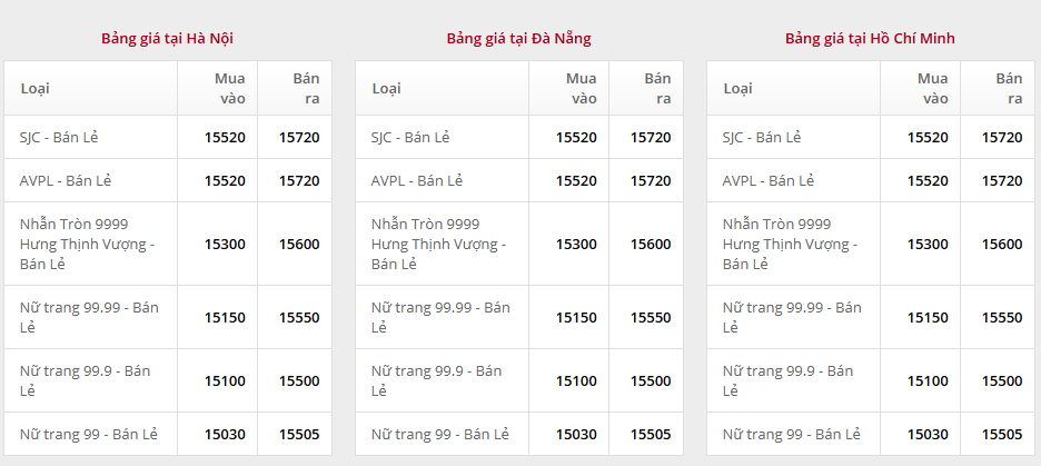 Giá vàng tại Công ty TNHH MTV Vàng bạc đá quý Sài Gòn (SJC):