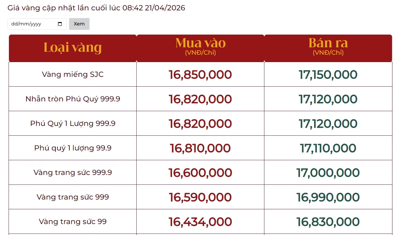 Cập nhật bảng giá vàng ngày 21/4 tại một số công ty vàng bạc đá quý trong nước.