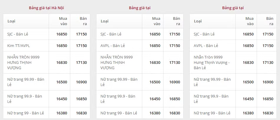 Giá vàng tại Công ty TNHH MTV Vàng bạc đá quý Sài Gòn (SJC):