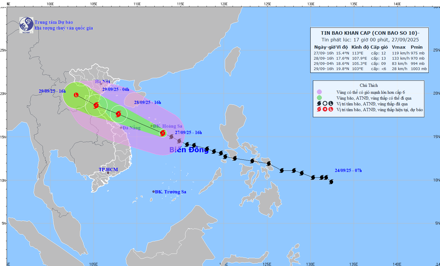 Trung tâm Dự báo khí tượng thủy văn quốc gia cho biết, vị trí tâm bão lúc 16 giờ ngày 27/9 ở vào khoảng 15,4 độ Vĩ Bắc; 113,0 độ Kinh Đông, cách đặc khu Hoàng Sa khoảng 170km về phía Đông Đông Nam. Sức gió mạnh nhất vùng gần tâm bão mạnh cấp 12 (118 - 133km/giờ), giật cấp 15. Bão di chuyển theo hướng Tây Tây Bắc với tốc độ 30 - 35km/h.