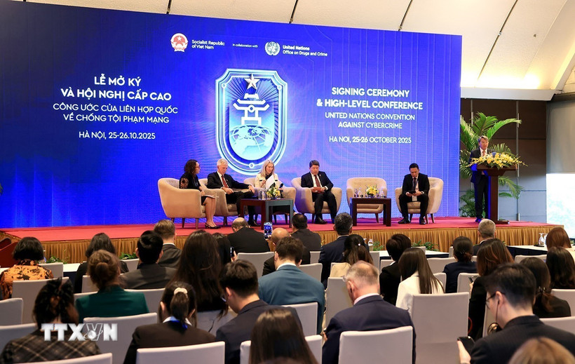 Quang cảnh một phiên tọa đàm trong khuôn khổ Lễ mở ký và Hội nghị cấp cao Công ước của Liên Hợp Quốc về Chống tội phạm mạng (Công ước Hà Nội)
