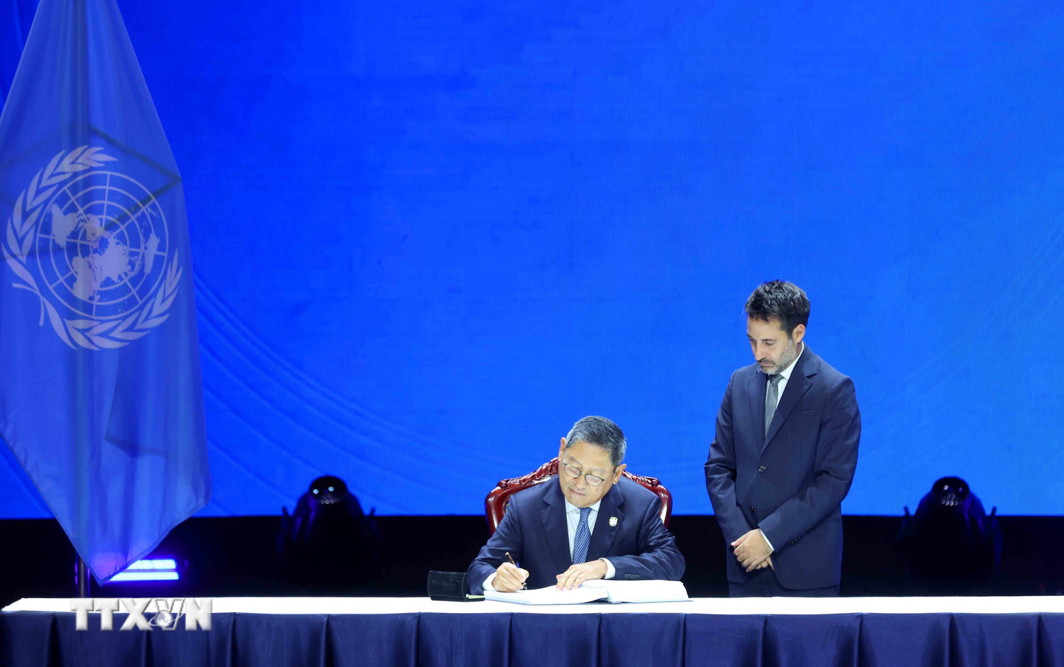 Phó Thủ tướng, Bộ trưởng Nội vụ Vương quốc Campuchia Sok Chenda Sophea ký Công ước của Liên Hợp Quốc về chống tội phạm mạng