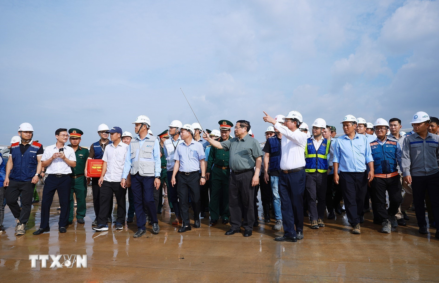 Kiểm tra, động viên các lực lượng đang thi công trên công trường, Thủ tướng Phạm Minh Chính biểu dương, cảm ơn các đơn vị, nhà thầu, đặc biệt là hơn 15.000 chuyên gia, kỹ sư, công nhân đang ngày đêm cùng 3.000 máy móc, thiết bị hối hả thi công, đẩy nhanh tiến độ để vận hành, đón chuyến bay đầu tiên vào ngày 19/12 và đưa cảng hàng không quốc tế Long Thành vào khai thác thương mại vào nửa đầu năm 2026.