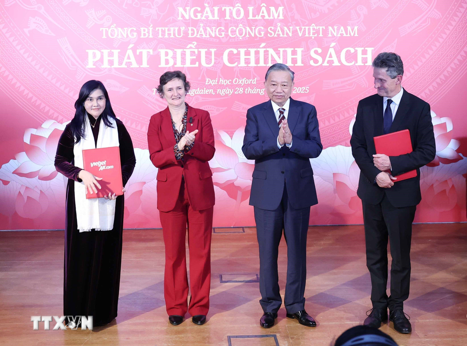 Trong khuôn khổ chuyến thăm chính thức Liên hiệp Vương quốc Anh và Bắc Ireland, chiều 28/10 (giờ địa phương), Tổng Bí thư Tô Lâm và đoàn đại biểu cấp cao Việt Nam đã gặp Ban lãnh đạo Đại học Oxford, Vương quốc Anh. Nhân dịp này, Tổng Bí thư Tô Lâm đã phát biểu chính sách trước các giáo sư, giảng viên, nhà nghiên cứu và đông đảo sinh viên, bạn bè của Việt Nam tại Đại học Oxford.