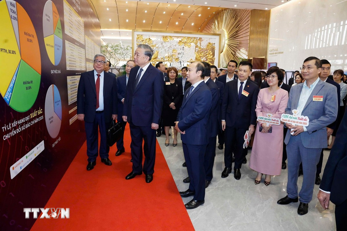 Tổng Bí thư Tô Lâm tham quan không gian trưng bày thành tựu chuyển đổi số trong báo chí