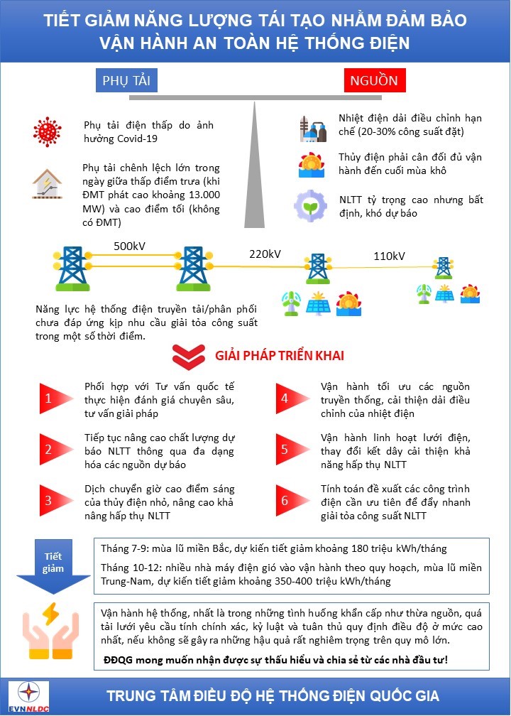 Trung tâm Điều độ hệ thống điện quốc gia cho biết, với những lý do nêu trên, việc tiết giảm khả năng phát các nguồn năng lượng tái tạo trong thời gian qua cũng như hiện nay là bắt buộc phải thực hiện để đảm bảo an toàn cung cấp điện.