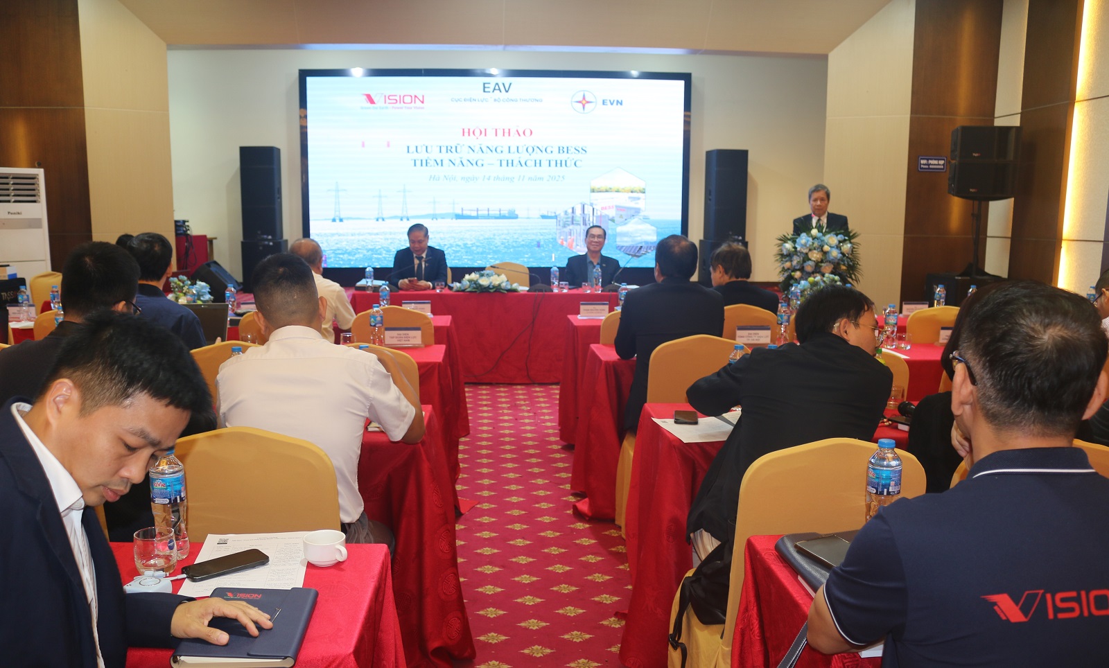 Ngày 14/11, tại Hà Nội, Cục Điện lực (Bộ Công Thương) tổ chức hội thảo “Lưu trữ năng lượng BESS: Tiềm năng - Thách thức”. Phó Cục trưởng Cục Điện lực: Bùi Quốc Hùng, Trần Hoài Trang cùng TS. Mai Duy Thiện, Chủ tịch Hiệp hội Năng lượng Sạch Việt Nam (VCEA) đồng chủ trì hội thảo.