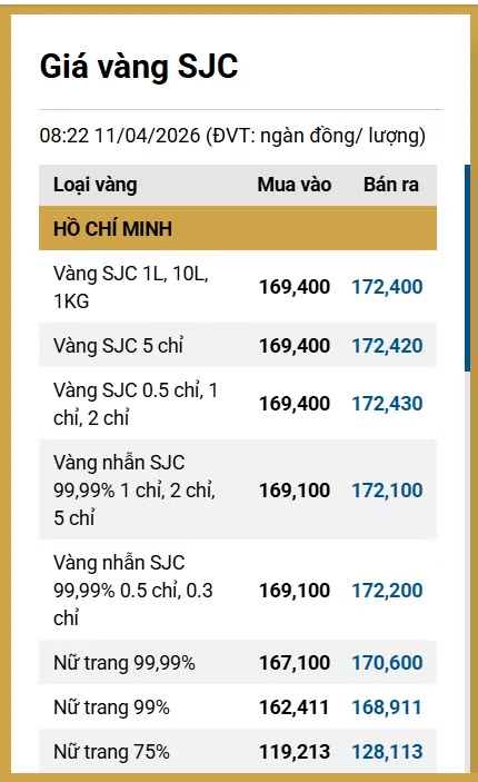 Tại Việt Nam, vào sáng 11/4, công ty Vàng bạc đá quý Sài Gòn niêm yết giá vàng SJC tại thị trường Hà Nội ở mức 169,4 - 172,4 triệu đồng/lượng (mua vào - bán ra).